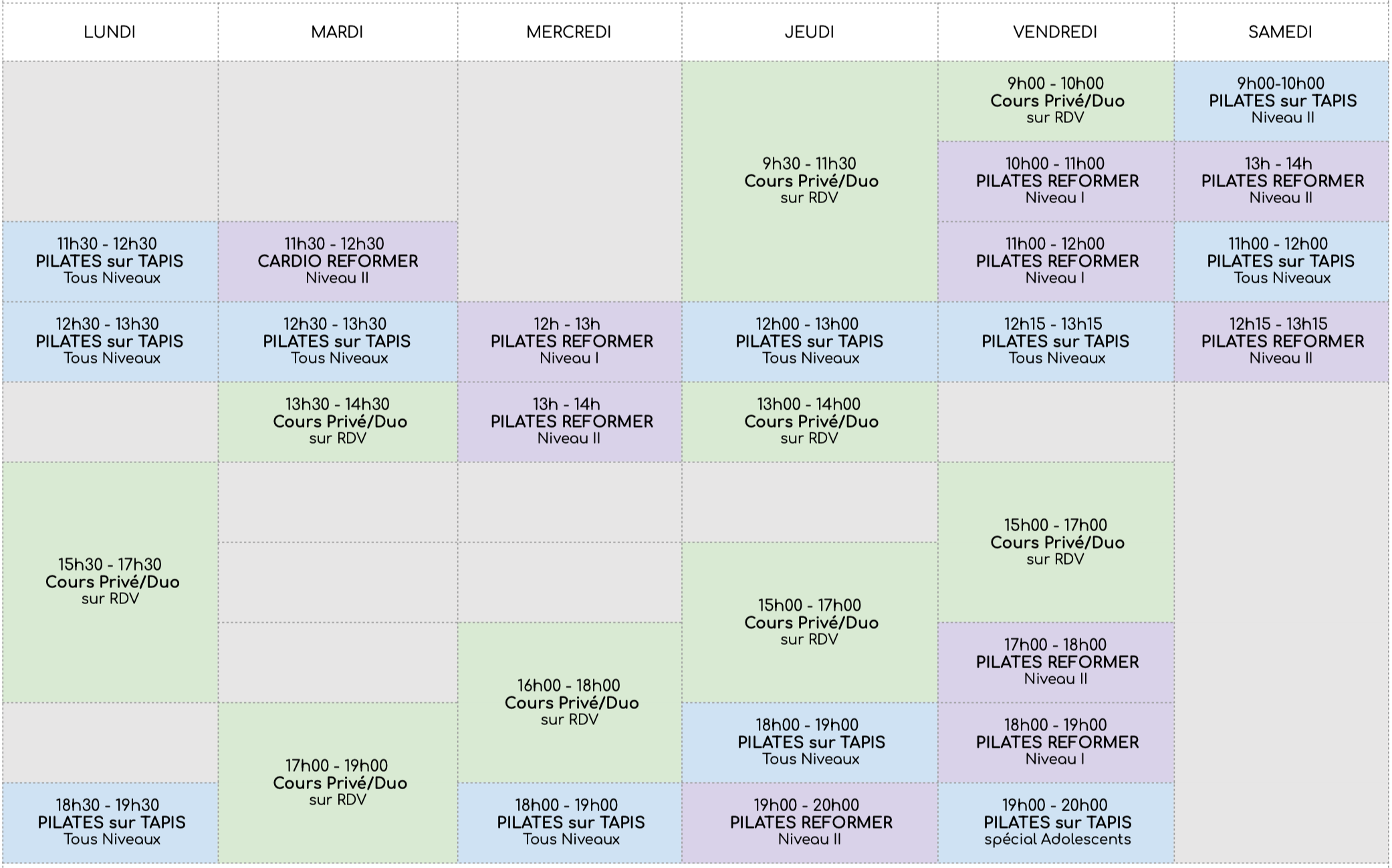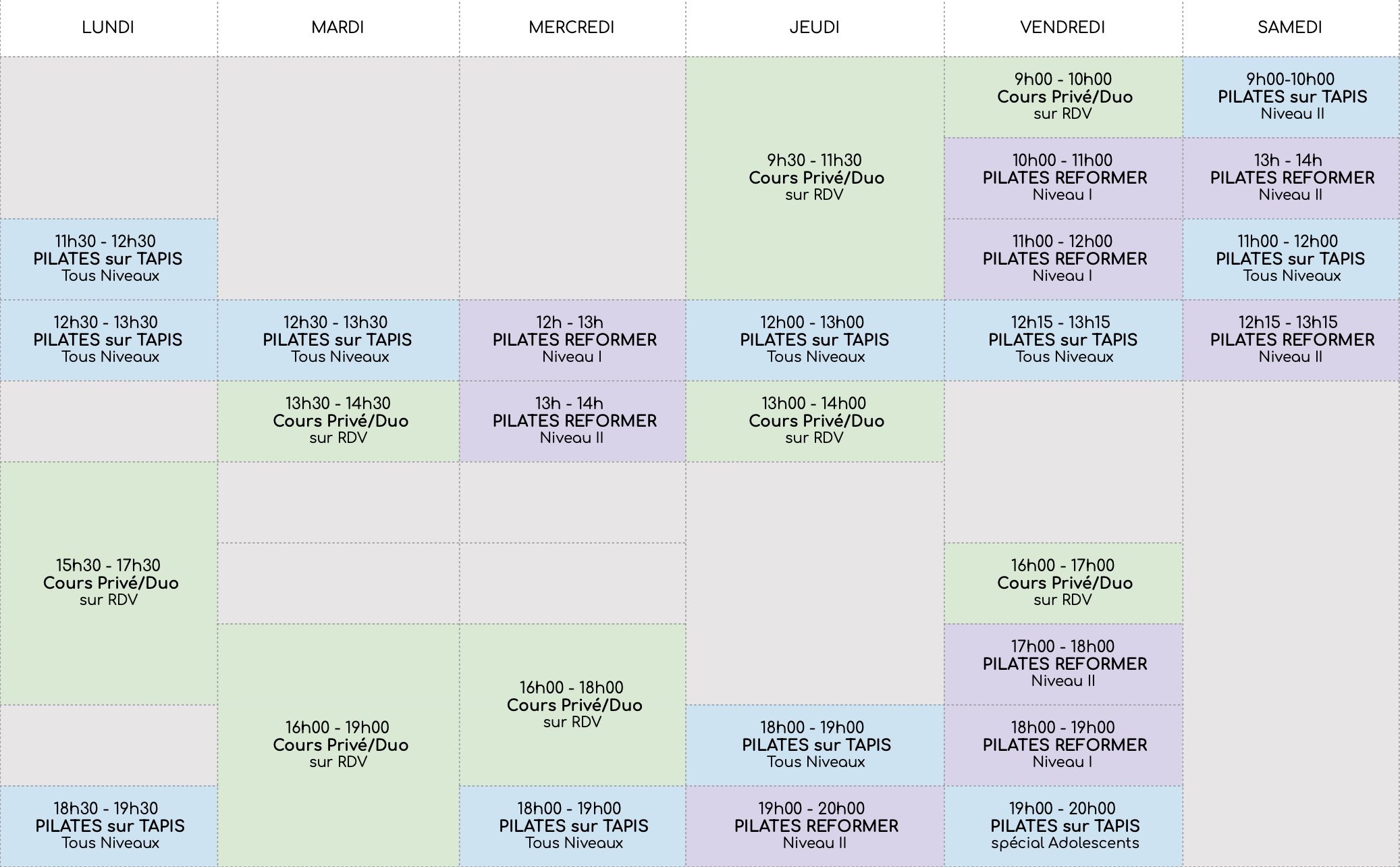 Réservations disponibles sur la page des plannings juste après le planning des cours privés/duo.