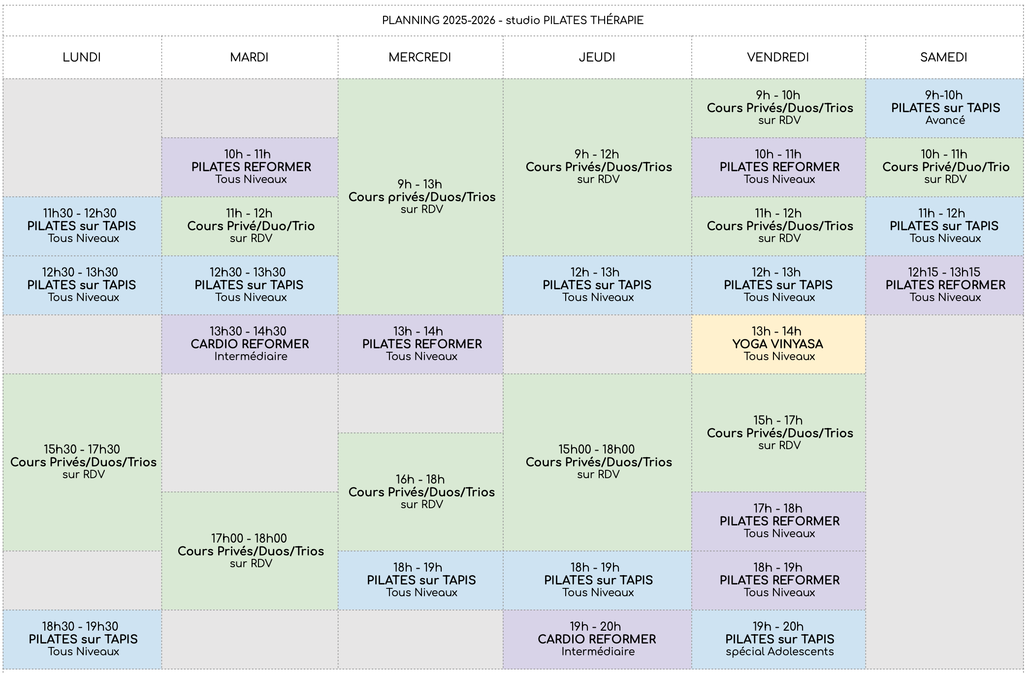 Réservations disponibles sur la page des plannings juste après le planning des cours privés/duo.